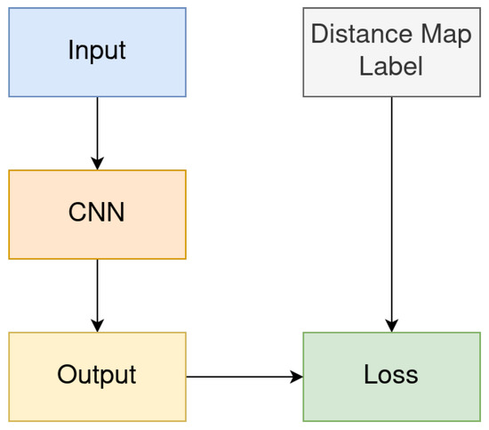 In our method, we use convolutional neural networks (CNNs) [21], whose output is the expected distance map. Figure 2 is a schematic diagram of the overall architecture of the method. In the figure, the “Distance Map Label” represents the distance map generated with the Distance Transform Method described in Section 3.5, “Input” represents the training image, and “Output” represents the distance map result produced by the network.