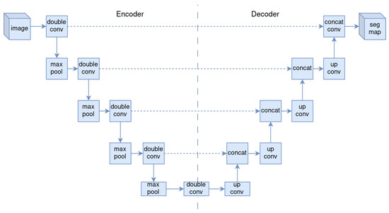 The U-Net encoder (downsampling) uses convolutions with kernels, ReLU activation function, and max pooling for each stage. The U-Net decoder (upsampling) uses upconvolutions, concatenation with the skip connection at the same level in the encoder, convolutions, and ReLU (see Figure 3).