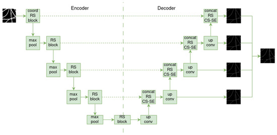 In addition, before passing through the encoder, the input image is processed by a coordinate convolutional layer [24]. This layer concatenates the input image with two additional channels, i and j, to map spatial coordinates to the Cartesian space. Residual squeezed blocks [25] are also used in both the encoder and decoder parts, replacing the basic convolutions blocks of U-Net. This helps prevent overfitting. In the decoder, the output of these blocks is passed to a channel squeeze and spatial excitation block [26], which maps its input to the spatial location .