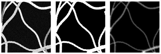 Distance map label steps creation: Left: source synthetic micrograph; middle: binary image from source; right: distance map obtained from binary image with Euclidean distance transform algorithm (Equation (5)).