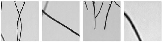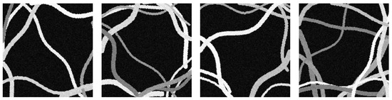 The result is three-channel RGB color images. Therefore, a micrograph of synthetic fibers is created from a random quantity and diameters. Each fiber is drawn based on the length, position, and orientation of the straight line generated by -randomness, with the length and with a random amplitude. The sinusoid representing the fiber’s curvature is created using the length and a random amplitude. Then, each point of the sinusoid is translated according to the position and orientation. Samples of these synthetic micrographs can be seen in Figure 8.