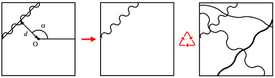 We used the randomness method described by Pourdeyhimi et al. [31], Abdel-Ghani and Davies [32] to generate a network of continuous filaments. Under this scheme, a line with a specific thickness is defined by a perpendicular distance d from a fixed reference point O, located in the center of the image, and the angular position of the perpendicular . The distance d is limited to the diagonal of the image.