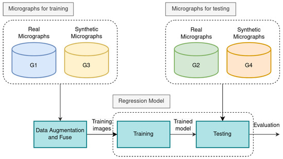 Proposed experimental protocol: In the training stage, the real and synthetic micrographs for training are augmented and fused. In the testing stage, the real and synthetic micrographs are used.