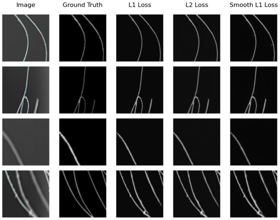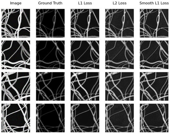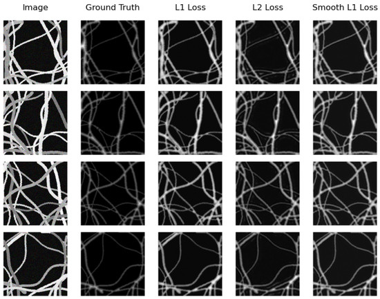 Samples of distance map results of the U-Net Regression using different loss functions on the synthetic testing subset.