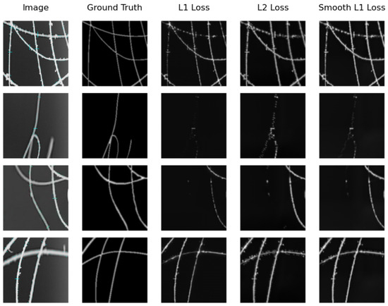 We can see that the model that obtains the best distance map in the real testing subset is U-Net Regression when using L1 Loss with an MAE of and when using L2 Loss with an MSE of . The worst results were obtained by SkeletonNet Regression with L2 Loss, although all results are acceptable. Figure 10 and Figure 11 show distance maps of testing in the real subset using the three loss functions and the two models.