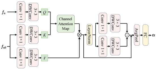 Both landmark-based and deep learning-based morphing generation methods perform linear interpolation of contributors’ identity information based on the morphing factor to construct the morphed facial identity information. Therefore, it is possible to obtain the accomplice’s identity features by learning the de-morphing factor for inverse linear interpolation and then restore the facial image of the accomplice. To achieve this goal, this method constructs a feature interaction-based de-morphing factor prediction network to learn the de-morphing factor corresponding to the morphed facial image, integrating the feature information of the morphed and the reference facial image. The structure details of the feature interaction-based de-morphing factor prediction network are shown in Figure 2. It mainly consists of convolution, depthwise separable convolution, and an attention mechanism. In the attention mechanism, this method uses the features of the reference facial image as the query and the features of the morphed facial image as the key and value. To fully utilize the channel information of features, this method adopts a channel-wise attention mechanism [40] to establish information interaction between the features of the morphed and the reference facial image. Compared to traditional attention mechanisms that focus on spatial relationships, channel-wise attention mechanisms can effectively reduce model complexity.
