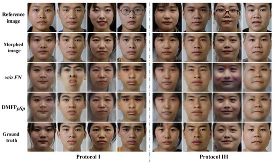 Comparative experiments were conducted on Protocol III of the HNU-FM dataset [41] to verify the effectiveness of the proposed method for landmark-based morphed facial images. The restoration accuracies of each method are presented in Table 2, and their visual results are illustrated in Figure 5.