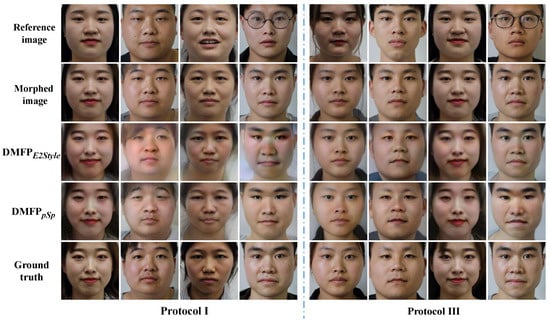 To evaluate the effectiveness of the proposed method, experiments were conducted on the HNU-FM [41] dataset and MIPGAN dataset from SYN-MAD [42]. HNU-FM adopts a landmark-based method, and all morphed facial images in the dataset have been verified by Face++ [43]. It consists of four sub-datasets: Protocol I, Protocol II, Protocol III, and Protocol IV. For our experiment, Protocol I and Protocol III datasets are selected, each containing 100 subjects (60 males and 40 females). In Protocol I, the pixel morphing factor is set to 0.5. The training set comprises 1121 morphed facial images and 1121 real facial images, the validation set consists of 564 morphed facial images and 299 real facial images, and the test set comprises 566 morphed facial images and 296 real facial images. For Protocol III, the pixel morphing factor varies between 0.1 and 0.9. It is divided into training set (1125 morphed facial images and 1121 real facial images), validation set (571 morphed facial images and 564 real facial images), and test set (570 morphed facial images and 566 real facial images). In the HNU-FM dataset, two scenarios are considered. In scenario 1, the reference images utilize neutral expression images. In scenario 2, to simulate real-world scenarios, the reference images may include different expressions, makeup, glasses, etc. In both scenarios, only real images that are not used for morphing generation are selected as reference images.