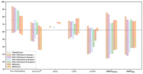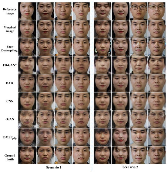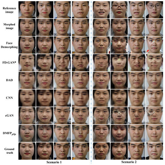 To validate the performance of the proposed model, this experiment compared it with several existing methods: Face Demorphing [25] (utilizing a de-morphing parameter of 0.3 within the recommended range in [25]), FD-GAN [26], DAD [27], CNN [24], and cGAN [36]. The evaluation was conducted on both the HNU-FM dataset [41] and the MIPGAN dataset [42]. Notably, the DAD method [27], which restores facial images of two contributors from a single morphed facial image, does not differentiate between Scenario 1 and Scenario 2 on the HNU-FM dataset.