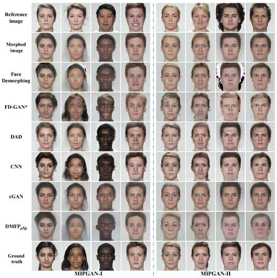 Comparative experiments are also conducted on the MIPGAN dataset [42] to evaluate the proposed method’s capability to restore morphed faces generated by GAN. Table 4 presents the restoration accuracy of all methods on this dataset, while their visual results are illustrated in Figure 7.