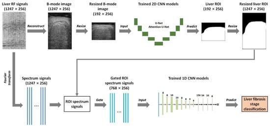 Flow chart of the proposed liver fibrosis stage classification method using deep learning models applied to ultrasound radiofrequency (RF) signals. First, two-dimensional (2D) convolutional neural networks (CNNs) were utilized for automatic liver region of interest (ROI) segmentation from B-mode ultrasound images reconstructed from RF signals. Second, one-dimensional (1D) CNNs were employed to classify liver fibrosis stages based on the frequency spectra (amplitude, phase, and power) of the segmented ROI signals. The white pixels in the liver ROI images represent the detected liver region whose values were 1, and the black pixels represent the detected non-liver region whose values were 0. The ROI spectrum signals were obtained by multiplying the spectrum signals by the resized liver ROI image. The size of the signals or the images is indicated as (a × b), where a is the sampling point number of a frame of signals or the height of an image, and b is the scan line number of the frame of signals or the width of the image.