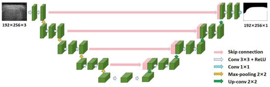 U-Net [] is a deep-learning network specifically designed for medical image segmentation. Its structure was an improvement over the fully convolutional network []. Figure 2 shows the network structure of U-Net. U-Net had a topology structure of an encoder and a decoder, with skip connections between them. The input to U-Net was a 3-channel B-mode ultrasound image sized 192 pixels × 256 pixels (height × width). On the left side of the network was the encoder (Figure 2), which captured contextual information and extracted features. An encoder layer consisted of two 3 × 3 convolutional layers with a step of 1 and one 2 × 2 max-pooling layer with a step of 2. The output of the convolutional layer was batch-normalized and then activated using a rectified linear unit (ReLU) []. On the right side was the decoder (Figure 2) for precise positioning. A decoder layer consisted of two 3 × 3 convolutional layers with a step of 1. The up-sampling in the decoder was performed using transpose convolution. The decoder used the extracted features and the information provided by skip connections to restore the size of the image and to produce fine segmentation. The output of U-Net was a 1-channel liver ROI binary image sized 192 pixels × 256 pixels (height × width).