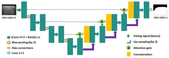 Attention U-Net [] was an extended network of U-Net [], which incorporated the attention mechanism into U-Net. Figure 3 shows the network structure of Attention U-Net. The network structure of Attention U-Net was similar to that of U-Net. In Attention U-Net, the attention gate was integrated into the skip connection and up-sampling modules. Through the attention mechanism, the networks could suppress irrelevant information in the image and highlight important local features.