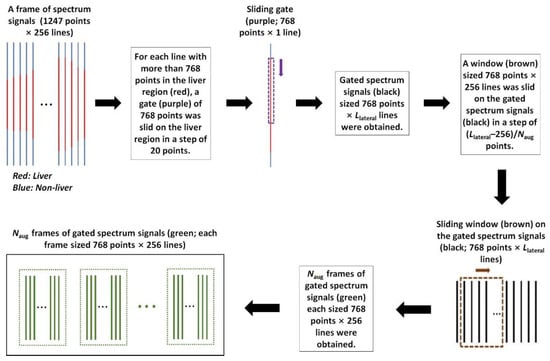To address the unbalanced data distribution issue and avoid overfitting [], a data augmentation method was employed for ROI spectrum signal augmentation before training the 1D CNN models. Take ≥F2 (i.e., binary classification between F0–F1 and F2–F4) for instance. The number of the ROI spectrum signals of F0–F1, N01, was less than that of F2–F4, N24. To avoid overfitting, the ROI spectrum signals of F0–F1 were augmented by a factor of Naug, Naug = N24/N01. Figure 4 shows the flow chart of the data augmentation for ROI spectrum signals. The input was a frame of spectrum signals sized 1247 points × 256 lines (axial × lateral). For each line with more than 768 points in the liver region (indicated as the red solid lines in Figure 4), a gate of 768 points (indicated as the purple dashed line in Figure 4) was slid on the liver region in a step of 20 points. As a result, we obtained a frame of gated spectrum signals (indicated as the black solid lines in Figure 4) sized 768 points × Llateral lines (axial × lateral). Next, a window (indicated as the brown dashed rectangle in Figure 4) sized 768 points × 256 lines (axial × lateral) was slid on the gated spectrum signals in a step of (Llateral − 256)/Naug to obtain Naug frames of gated spectrum signals (indicated as the green solid lines in Figure 4); each frame sized 768 points × 256 lines (axial × lateral). Note that the sizes of the sliding gate (768 points × 1 line) and the sliding window (768 points × 256 lines) were experimentally set. After data augmentation, the spectrum signal samples were randomly divided on the participant level into a training set, a validation set, and a test set in accordance with a ratio of 80%:10%:10%.