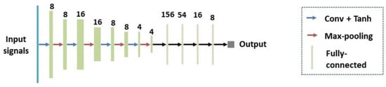 Figure 5 shows the network structure of the 1D CNN for liver fibrosis stage classification. The 1D CNN had four 1D convolutional layers, four max-pooling layers, and four fully-connected layers. The features extracted by the convolutional and pooling layers were integrated into a single 1D feature vector. The 1D feature vector was taken as an input to the fully connected layer to output a prediction. Tanh(.) [] was used as the activation function, which had a fast convergence speed and could effectively avoid oscillation of loss values.