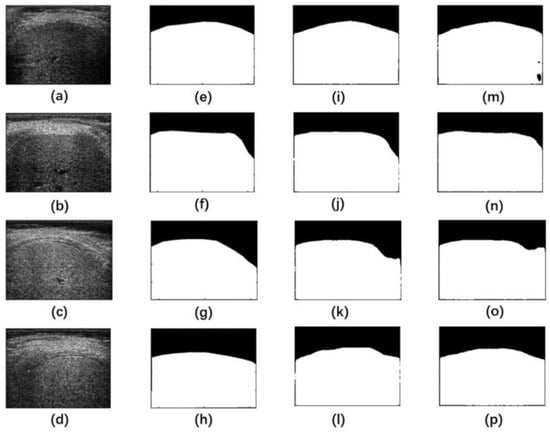Representative liver ROI segmentation results on the test set in Group A by U-Net and Attention U-Net. (a–d) Liver B-mode ultrasound images, (e–h) manual delineation as the reference standard, (i–l) segmentation images by Attention U-Net, (m–p) segmentation images by U-Net. The white pixels in the segmentation images represented the segmented liver region, and the black pixels represented the segmented non-liver region. ROI: region of interest.