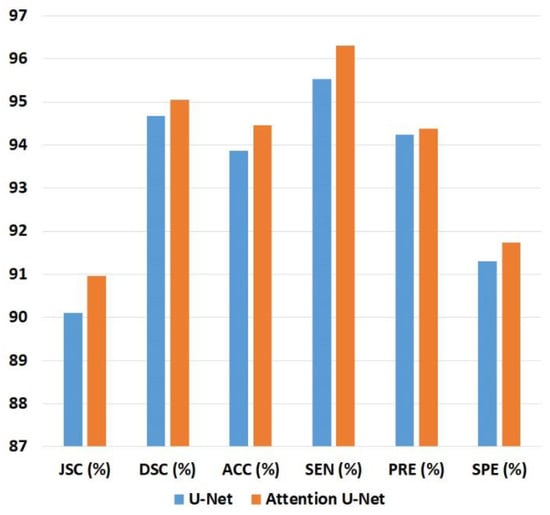 Bar chart of the results in Table 1. JSC: Jaccard similarity coefficient; DSC: Dice similarity coefficient; ACC: accuracy; SEN: sensitivity; PRE: precision; SPE: specificity.