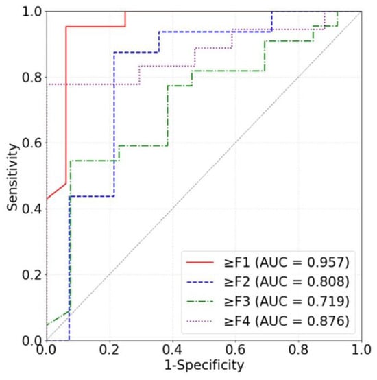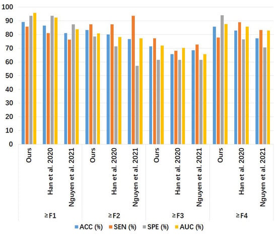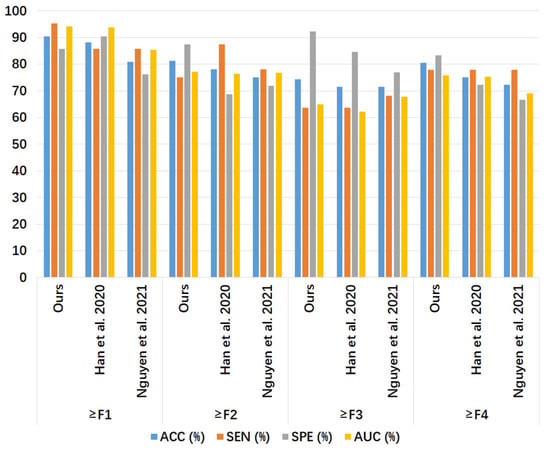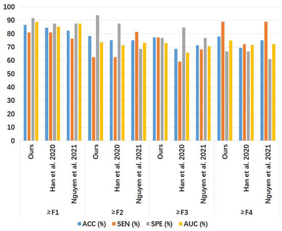 Table 5 and Figure 10 show the liver fibrosis stage classification performance on the power spectrum test set by the proposed method, compared to that of the 1D CNN models of Han et al. [] and Nguyen et al. []. For ≥F1, the values of ACC, SPE, and AUC of our model were higher than those of the other two models with the same SEN. For ≥F2, our model had higher values in ACC, SPE, and AUC than the other two models, with an SEN value lower than Nguyen et al.’s model [] and equal to Han et al.’s model []. For ≥F3, our model had ACC, SEN, and AUC values higher than the other two models, with an SPE value lower than Han et al.’s model [] and equal to Nguyen et al.’s model []. For ≥F4, our model had ACC and AUC values higher than the other two models, with an SEN value equal to Nguyen et al.’s model [] and higher than Han et al.’s model [], and with an SPE value equal to Han et al.’s model [] and higher than Nguyen et al.’s model [].