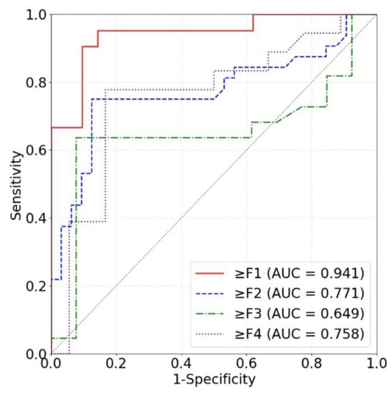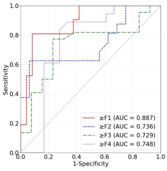ROC curves of the proposed method based on phase spectra for classifying liver fibrosis stage ≥F1 (red), ≥F2 (blue), ≥F3 (green), and ≥F4 (purple). ROC: receiver operating characteristic; AUC: area under the ROC curve.