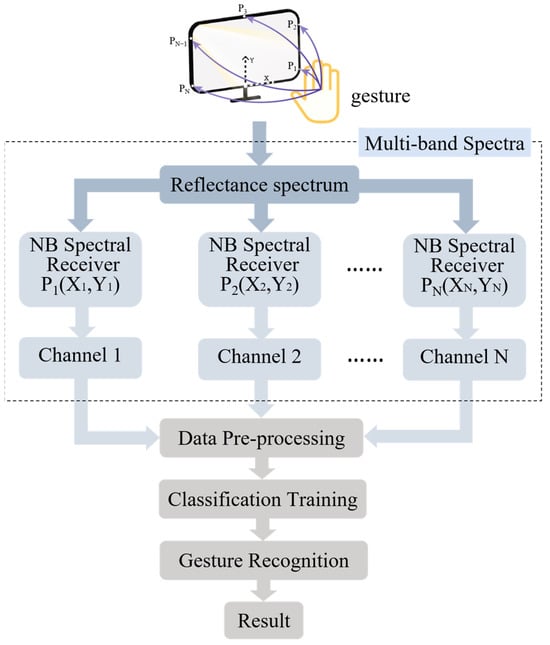 A gesture recognition method based on multi-band spectral features is proposed in this work, which combines the spectral and spatial characteristics of screen light reflected from gestures. The specific process is illustrated in Figure 1. The intelligent gesture recognition system according to this method mainly consists of a light-emitting display screen and a plurality of narrowband spectral receivers. The system works by orienting the target gesture toward the screen, in which the screen serves the purpose of providing illumination on the gesture while displaying normally. The light information reflected by the gesture is captured by multiple narrowband spectral receivers mounted on the screen. These receivers are installed at different positions on the plane where the screen is located, and the reflected light from the gestures generates different spectral distributions in various spatial locations. Furthermore, these receivers capture narrowband spectra from different bands and convert them into photonic signals to obtain light-intensity measurements. As a result, spectral data containing various bands from different coordinates can be received, which provides the possibility to train different characteristics in frequency and spatial domains. Based on the measurements from multiple receivers and combined with classification algorithms, different gestures can be effectively classified, significantly improving classification efficiency and recognition accuracy.