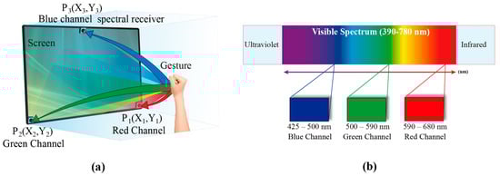 According to the method, an RGB three-channel narrowband spectral gesture recognition system is realized as shown in Figure 2a, with three narrowband spectral receivers installed at different coordinates of the screen plane. The light emitted from the screen is reflected by the gestures and then captured by receivers positioned at three coordinates on the screen: bottom-right, bottom-left, and top-center. These receivers record narrowband spectral data corresponding to the red, green, and blue channels, as in Figure 2b. Consequently, the three-channel data incorporate both spectral and spatial information features.
