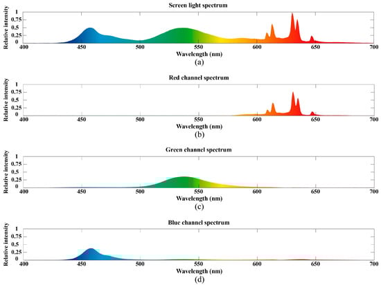 Spectral filtering effects of the filter films on display light measured by the spectrometer: (a) The spectrum measured by the spectrometer when the screen emits white light; (b) the spectrum through the red channel narrowband filter; (c) the spectrum through the green channel narrowband filter; (d) the spectrum through the blue channel narrowband filter.