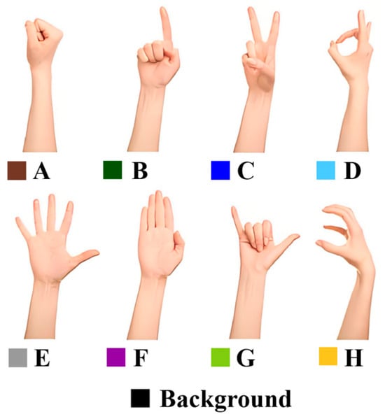 Section 2 of the system is designed for implementing gesture-based HCI, applied in eight gestures as depicted in Figure 5, each annotated with a distinct color. The term “Background” refers to the scenario where no gesture is present in front of the screen, serving as a baseline control. The process of data collection is conducted through the RGB three-channel spectral receivers of the system setup, with the datasets structured into two main groups, labeled Dataset 1 and Dataset 2.