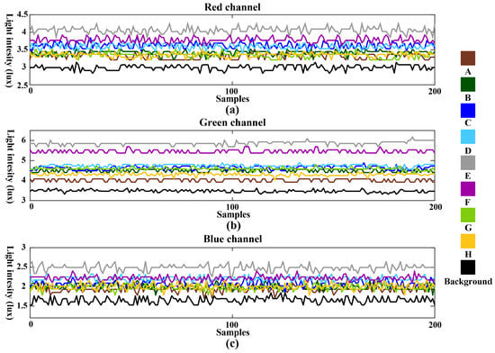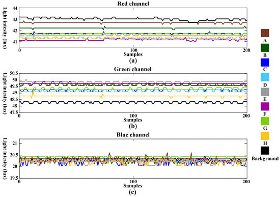 The light intensity data from RGB three-channel spectral receivers under ambient light conditions for the eight gestures and control group: (a) data from the red channel; (b) data from the green channel; (c) data from the blue channel.