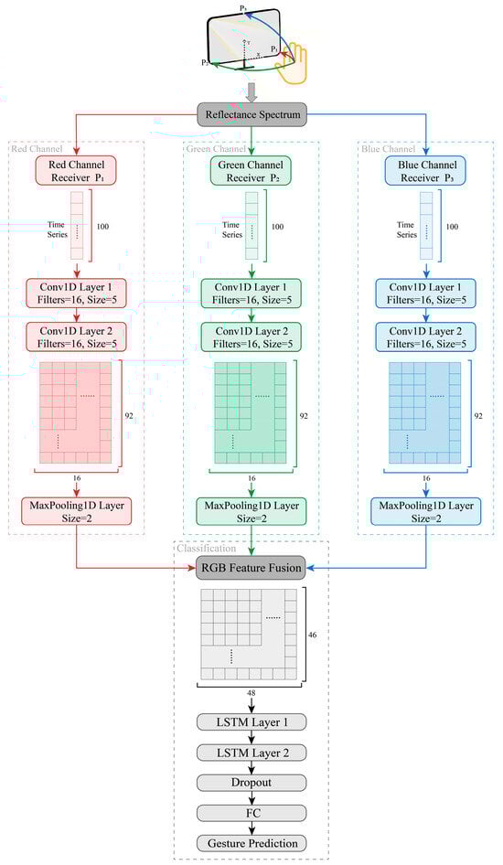 This section presents a gesture recognition model that integrates RGB multi-channel 1-dimensional convolutional neural network (1D-CNN) and LSTM architectures. The model processes RGB three-channel light intensity time series as the input and generates gesture classification predictions as the output, as depicted in Figure 8. Initially, RGB multi-channel 1D-CNN is employed to extract multidimensional features from the input time-series data. Subsequently, these feature sequences are fed into LSTM for gesture classification. This hybrid approach effectively harnesses the feature extraction capabilities of 1D-CNN and the sequence modeling capabilities of LSTM. It synergizes with the multi-channel spectral information acquisition capability of the system hardware in this work, enabling accurate gesture-based HCI.