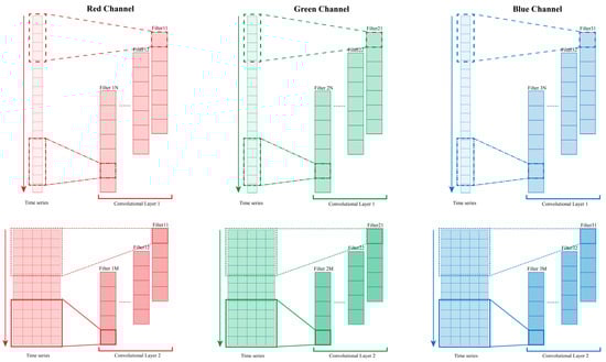 CNN can serve as a feature extractor [44], specifically, employing 1D-CNN for the analysis of time-series data from sensors. Accordingly, two layers of 1-dimensional convolution (Conv1D) are employed to extract multidimensional features from RGB three-channel data. Figure 9 illustrates the process of extracting time-series features. Each sample input to the gesture recognition model consists of 100 data points sampled over 1 s. Filters convolve with the time series to extract features. Each Conv1D layer incorporates 16 filters with a window size of 5, sliding down the data with a default stride of 1. The input data comprise RGB three channels, forming a 100 × 3 matrix that corresponds to the three channels in the Conv1D layers. Each channel shares the same structure but employs different filter combinations based on the data characteristics, thus enhancing the representation of the input time-series features. Finally, following a 1-dimensional max pooling (MaxPooling1D) layer with a size of 2, the features are merged across multiple channels as shown in Figure 8, resulting in each sample being represented as a multidimensional feature sequence of size 46 × 48 matrix.