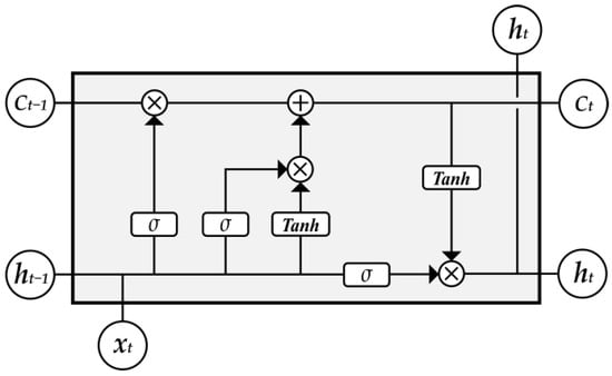 LSTM networks [45], a specialized category of recurrent neural networks (RNNs), are proficient in identifying and forecasting both short-term and long-term dependencies within time-series data [46]. Information is transmitted among different cells of the hidden layer through several controllable gates [47], as depicted in Figure 10. The symbol represents the memory cell state. The network contains input gate , output gate , and forget gate . The input gate determines the contributions of the input data at time step for updating the memory cell, while the forget gate determines how much of the last moment’s cell is retained for the current state . The output gate controls how much information is output for cell status. Finally, represents the next state. The LSTM network updates its information through the following Equations (2)–(9):