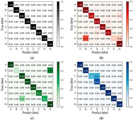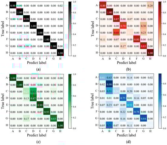 The confusion matrix results of Experiment I: (a) The confusion matrix result of RGB three-channel gesture classification; (b) the confusion matrix result of red-channel gesture classification; (c) the confusion matrix result of green-channel gesture classification; (d) the confusion matrix result of blue-channel gesture classification.