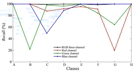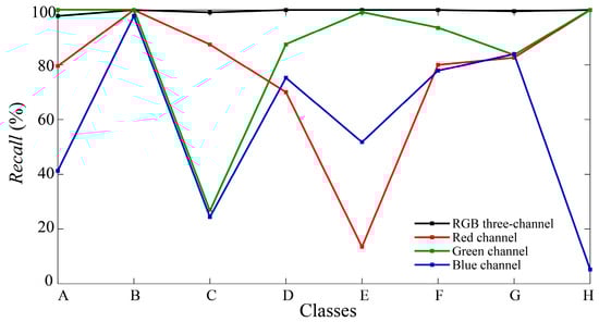For a clearer comparison, Figure 12 displays the recall results for each class across the different classification models. Recall assesses the classifier’s ability to correctly identify all positive instances [49]. Analysis of the curves in Figure 12 reveals varying effectiveness of different channels in recognizing each gesture. For example, the classification model trained on the red channel performs poorly for gesture G due to similarities in light intensity with gesture B, as observed in the sampling data of Figure 6, resulting in misclassification of G. Similarly, the green channel shows inadequate recognition of gesture B. In the blue channel, gestures C and D exhibit frequent confusion while demonstrating robust performance for other gestures. The disparate recognition performances across single channels highlight distinct spectral characteristics. Screen-reflected light for the same gesture exhibits spectral variation across different coordinates and is captured by diverse narrowband receivers, further differentiating the data from each channel. Additionally, features of the single channels are limited, leading to notably poorer recognition of specific gestures. In contrast, the multi-channel classification model mitigates these challenges by combining RGB three-channel spectral data from different spatial coordinates, thereby improving the accuracy of gesture recognition. In conclusion, the integration of multi-band spectral features with spatial information markedly enhances the accuracy of gesture recognition.