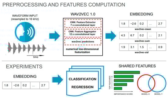 Due to the dynamic representation of the wav2vec embedding over time [22], we computed a derived 1D static feature vector of 512 dimensions for each recording based on three different statistics (mean: wav2vec-mean, standard deviation: wav2vec-std, sum: wav2vec-sum) along the time axis. The output of this method served as the input for machine learning models for classification and regression. Similar approaches exist in the literature to aggregate specific DL audio embeddings, as seen in TRILLsson and wav2vec 2.0 [45]. Since feature extraction from long recordings requires relatively complex computation in [45], the authors divided long recordings into 10-s segments. However, with wav2vec for this research, we found this segmentation to be unnecessary, allowing us to process the entire signal without the need to split it into sections.
