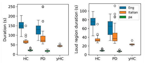 The Italian and English datasets analyzed during the current study are publicly available [59,60]. Italian data [59] are available at the following URL: https://ieee-dataport.org/open-access/italian-parkinsons-voice-and-speech (accessed on 22 July 2024). English data [60] are available at the following URL: https://zenodo.org/records/2867216 (accessed on 22 July 2024). The dataset comprised of participants rhythmically repeating the syllable /pa/ is not openly available at this moment and is available from the corresponding author upon reasonable request.