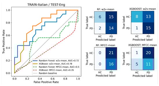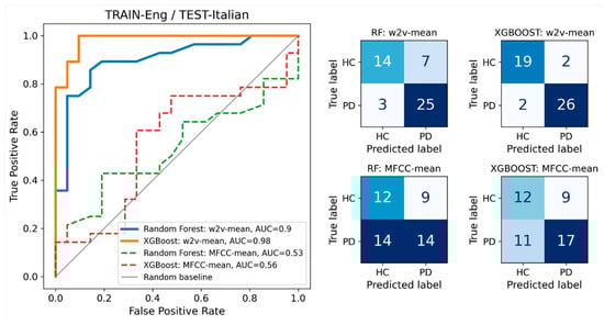 TRAIN-Italian/TEST-Eng: AUROC curves for the two speech representations and two classifiers. The plot on the left shows that wav2vec outperformed MFCC when trained on Italian data and tested on English data. Similar to the observations in Figure 3, XGBoost demonstrated improved performance compared to the random forest classifier. Detailed classification results for each classifier are presented in the corresponding confusion matrix on the right. In this plot, the results were not cross-validated; instead, the classifier was trained on the entire dataset #1 and tested on the entire dataset #2.