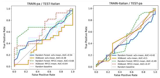 The first scenario involved models trained on individual datasets and evaluated on the same datasets, covering three cases—/pa/, Italian, and English datasets separately. For /pa/, the top-performing model was achieved with 10 PCA MFCC-mean, slightly outperforming the wav2vec-sum. The combination of wav2vec and MFCC features did not enhance overall performance. Remarkably, an excellent performance was observed across all models for the Italian dataset. In the case of the English dataset, AUROCs varied, with 0.74 for the MFCC-mean model and the best-performing model reaching 0.80 for wav2vec-std.