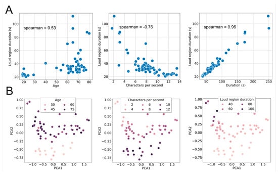 (A) Correlations between the features from the Italian dataset and the calculated duration of loud regions. (B) PCA plots depicting the relationship between wav2vec-mean features. The close grouping of similar colors suggests a nonrandom signal across all wav2vec-mean features. Each data point corresponds to one subject.