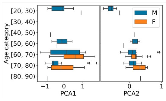 Boxplots illustrating 2 PCA components of wav2vec-mean, organized into distinct classes based on age and presented in separate panels for each component. The plots emphasize gender-related differences.