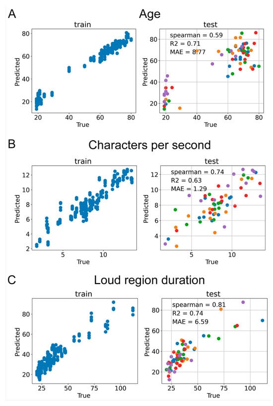 Performances of audio-wav2vec-based regression models on both training and testing data. Each distinct color in the plot corresponds to an individual run of cross-validation, specifically: (A) modeling age, (B) modeling characters per second, and (C) modeling loud region duration.