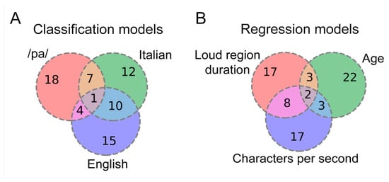 Feature importance assessments were conducted for various classification and regression models utilizing wav2vec-mean features. We focused on the top 30 impactful features, ranked from the most influential to the least, out of the complete set of 512 features. The connections between classification and regression model profiles are presented in Figure 9A and Figure 9B, respectively. Overall, the Fisher exact tests indicated a significant number of common features in all model pairs (p < 0.05). In the binary classification models (Figure 9A), the strongest association was identified between the Italian and English speech datasets (11 shared features). For regression (Figure 9B), the overlap between the model explaining loud region duration and the model explaining characters per second was more pronounced (10 shared features) than with the model explaining age (5 shared features). The increased number of shared features between loud region duration and characters per second aligns with the observed correlation coefficients between loud region duration vs. characters per second (Spearman R = −0.76), compared to the correlation between loud region duration vs. age (Spearman R = 0.53), as shown in Figure 6A. Taking into account the stringent Bonferroni corrected comparisons, certain pairs that had shown significance using the Fisher exact test were no longer significant (i.e., had fewer than 6 shared features). This applied specifically to the classification comparison between /pa/ and English, as well as both articulation rate models versus age.