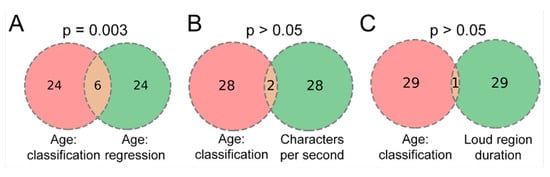 Comparative analysis of important features identified by the binary age classification model vs. top features derived from three regression models: (A) age:classification vs. age:regression, (B) age:classification vs. characters per second:regression, (C) age:classification vs. loud region duration:regression.