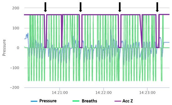 Sensor data: Pressure during inhalation and exhalation (blue), representation of single breaths (green), and regurgitation events (Acc Z, purple) recorded by the internal acceleration sensor (without units because of adjustments for graphical illustration). Four regurgitations are visible in the above figure (black arrows).