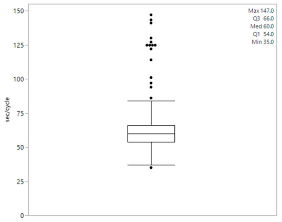 Regarding the duration of each rumination cycle (n = 359), we found that the values did not follow a normal distribution. The median duration was 00:01:00 (h:m:s), with a minimum of 00:00:35 and a maximum of 00:02:27 per cycle. The distribution of the cycle lengths is shown in Figure 3. Recalculation of the duration of rumination cycles after deleting the outliers recorded in one cow with nonphysiological values led to a normal distribution and a mean duration of 59.27 ± 9.01 s per cycle.