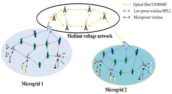 This paper considers the communication network scenario for smart distribution grids on the medium–low-voltage side, as depicted in Figure 1. The network scenario mainly consists of multiple microgrids and network exchange centers. Microgrids serve as the basic units, forming a multi-layered, interconnected, large-scale meshed information network that is flexibly interconnected on demand. This network supports massive heterogeneous terminals for seamless access and meets the requirements for micro-scheduling. Within each microgrid, there is a high degree of autonomy, allowing for interaction with the distribution grid and information exchange. This setup addresses the challenges posed by the large-scale integration of new energy sources and new types of loads, enabling plug-and-play functionality.