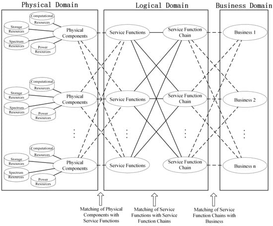 The scenario is modeled as a three-domain model, as shown in Figure 2, which includes the service domain, logical domain, and physical domain. The definitions and representations of each domain in the three-domain model are introduced separately.