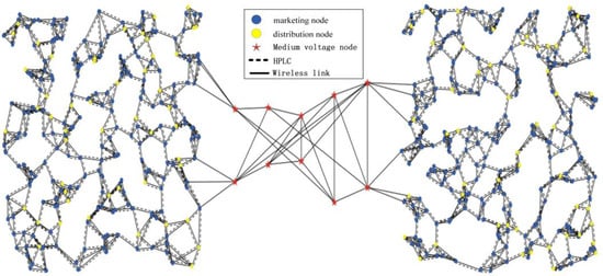 The simulation considers two microgrids, with a total of 500 grid devices randomly distributed. Among them, there are 400 marketing nodes responsible for generating marketing-related services and 100 distribution nodes responsible for generating distribution-related services. The links between nodes in the microgrid can be either wireless or wired. The communication radius between nodes within the microgrid is set to 50 m. The connection between the two microgrids is established through a medium-voltage power grid, distributed within an area of . The service data in the network topology are as shown in Table 1 and Table 2, and simulation parameters are shown in Table 3. The corresponding network topology is illustrated in Figure 4.