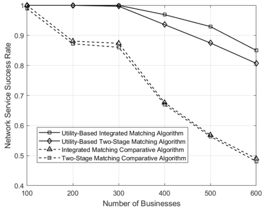 Comparison of network-service success rates under different business counts for various matching schemes.