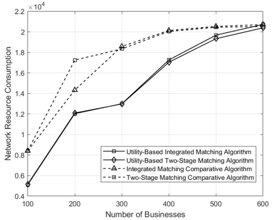 Comparison of network resource consumption under different matching schemes across varying numbers of businesses.