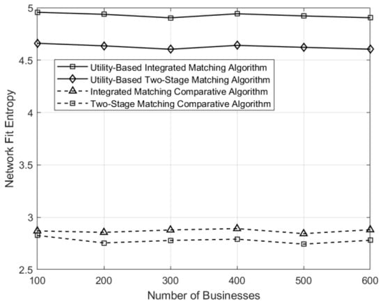 Comparison of network entropy under different matching schemes across varying numbers of businesses.